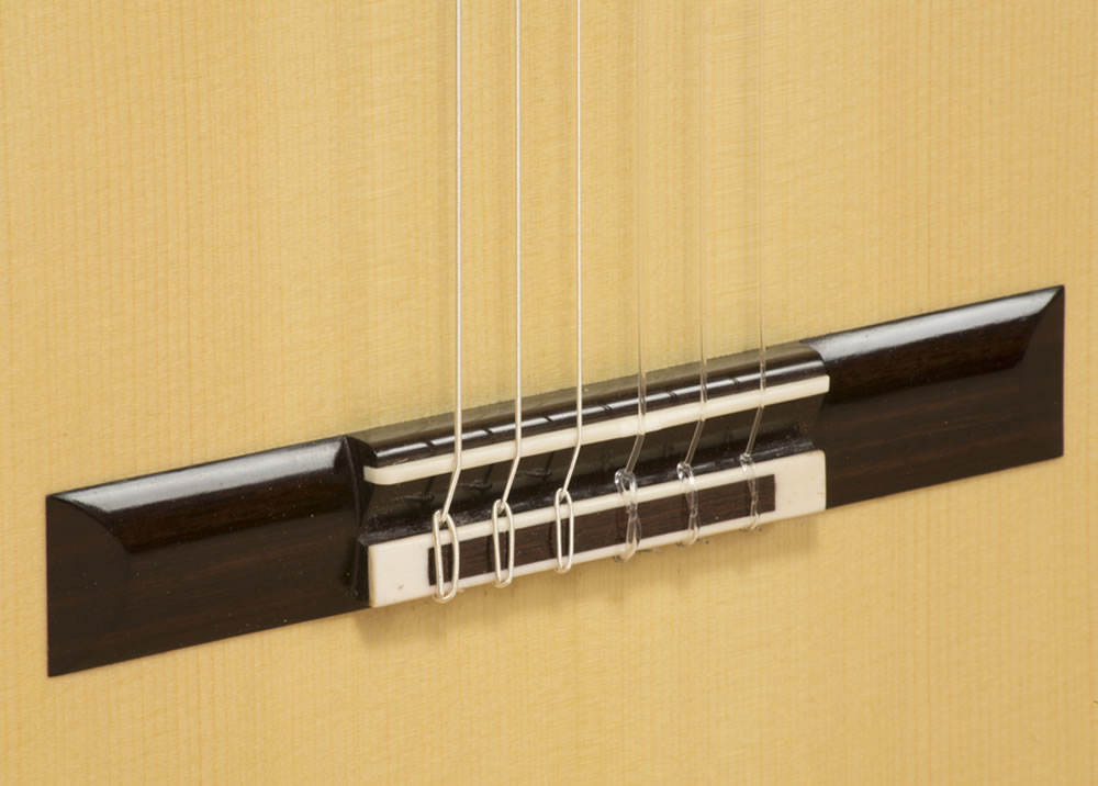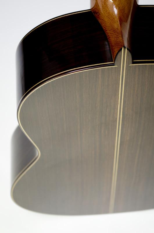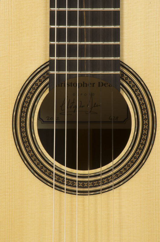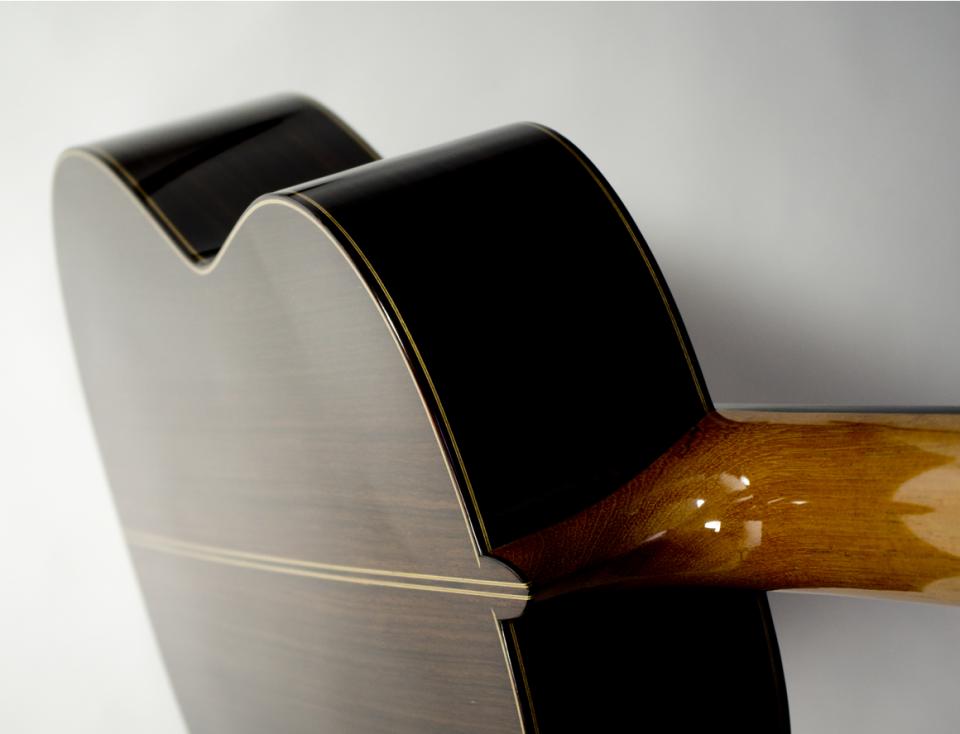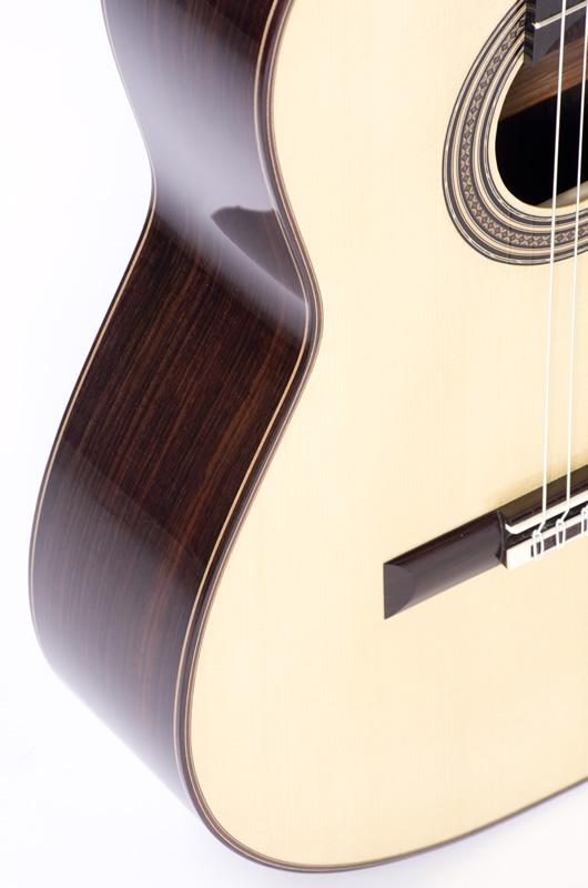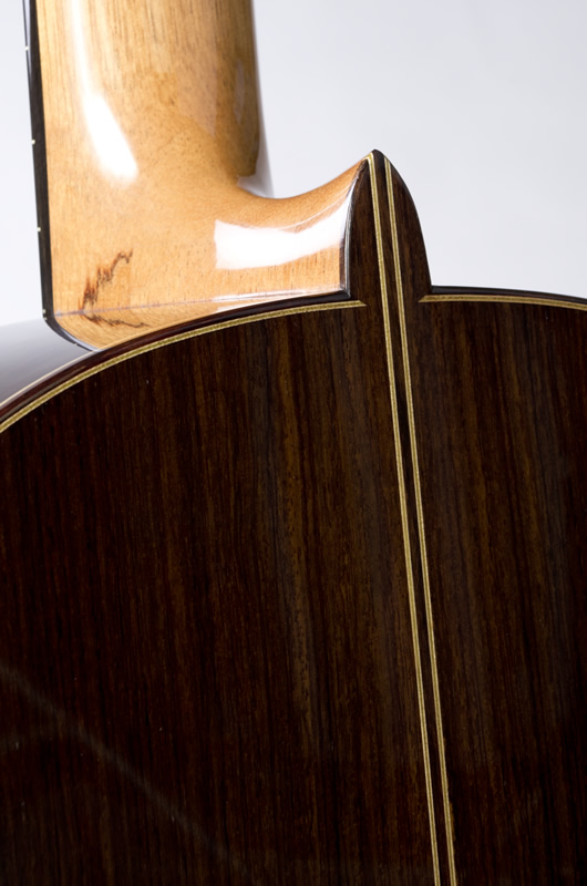I use the finest European spruce along with Indian Rosewood or CITES approved Brazilian rosewood/Jacaranda for the back and sides. The neck is either South American mahogany or cedrela and the fingerboard ebony. I finish the guitar by French polish and fit top quality tuners, either Rodgers, Scheller or Alessi, with snakewood or mother of pearl buttons.